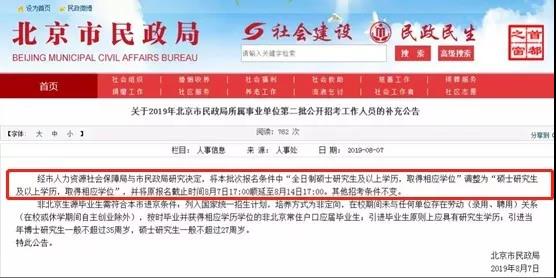 隨后,2019年8月7日,北京市民政局官網,發布了如下的一則補充公告,再次強調了教育部文件中提到的:全日制和非全日制研究生實行相同的考試招生政策和培養標準,其學歷學位證書具有同等法律地位和相同效力。