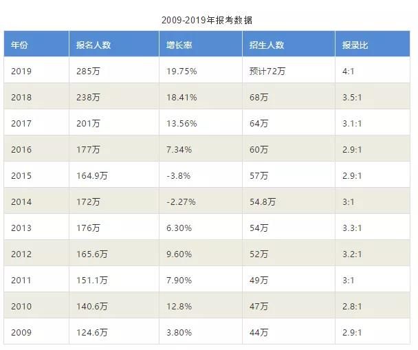 首先,以下這張圖片相信大家應該不陌生,是根據教育部數據統計。在2018年考研報考人數達到238萬,比2017年增加37萬人,增長18.4%。其中,應屆考生131萬人,比去年增加18萬人,往屆考生107萬人,比去年增加19萬人,而19考研報名人數達到了285萬人,考研增加人數和增長率均為近年來最高。