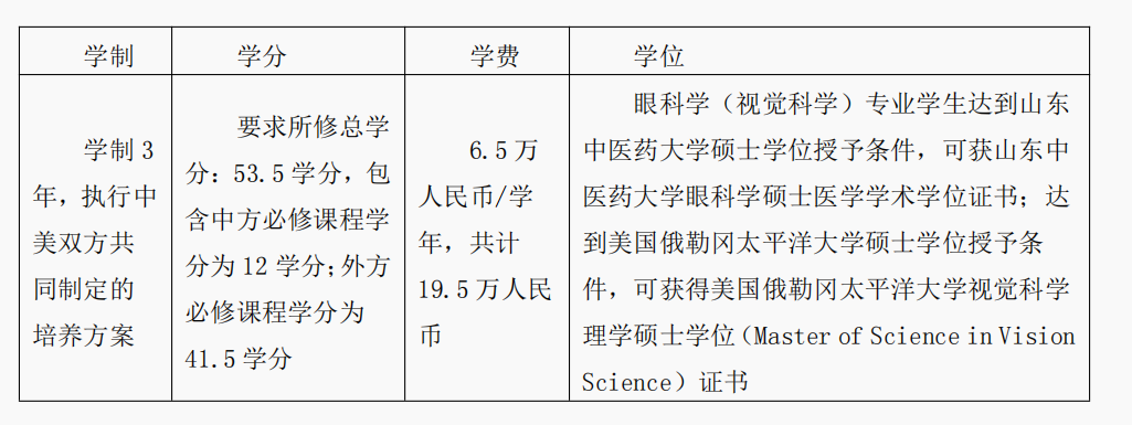 眼科學(視覺科學)專業是由山東中醫藥大學與美國俄勒岡太平洋大學聯合辦學開設, 引進美國太平洋大學先進的眼視光學專業教育理念和優質的教學資源,通過雙方教師聯合授 課,雙語教學的方法,引入太平洋大學特色課程,注重培養學生專業能力和良好的科學素養、 獨立探索和創新能力。