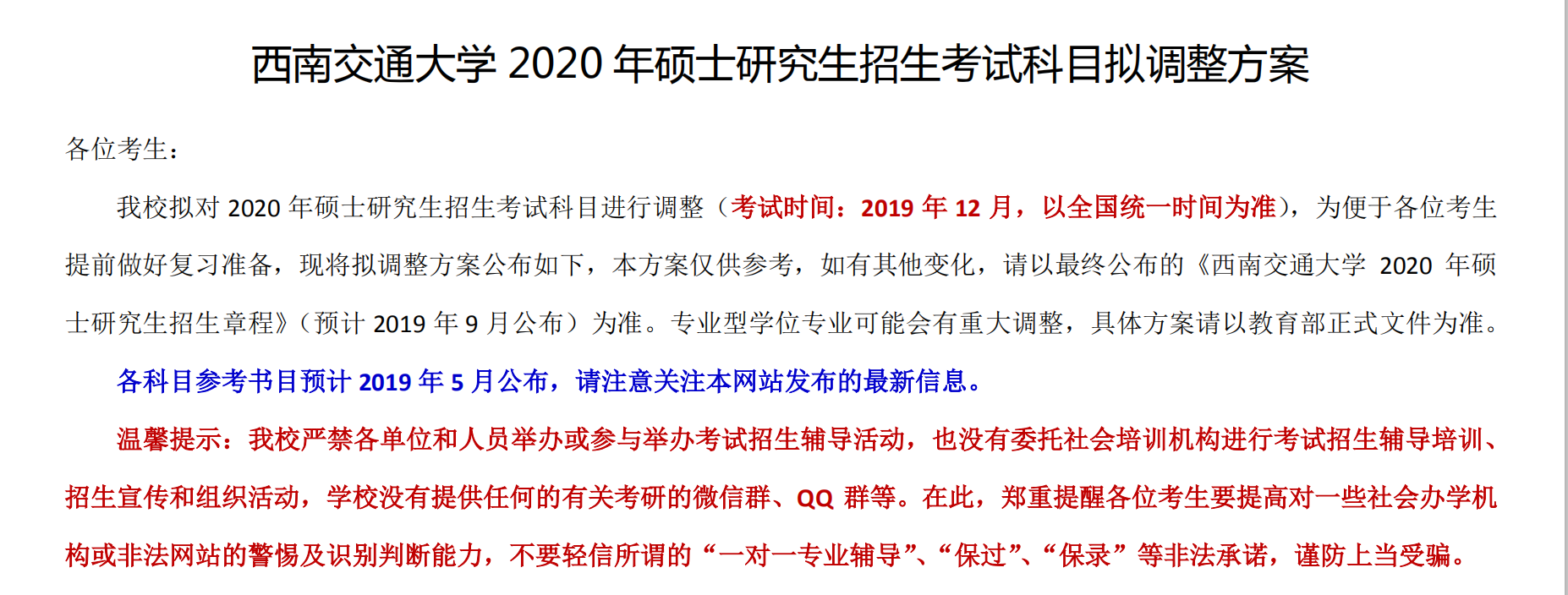 上面就是給大家整理的西南交通大學2020年碩士研究生招生考試科目擬調整方案的相關內容,如有更多疑問,請及時咨詢在線老師。