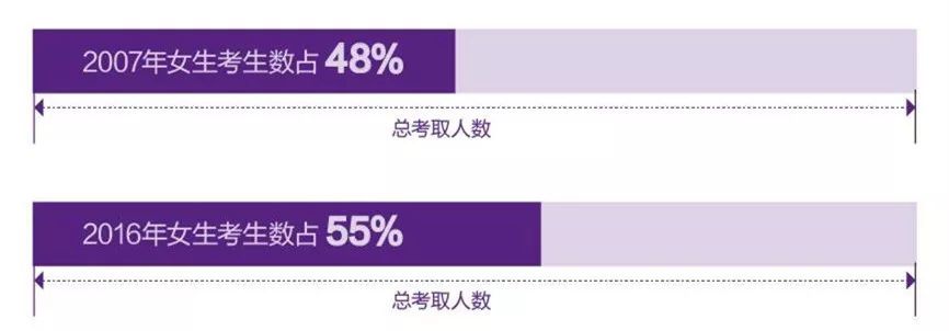 從性別比例來(lái)看,女生已經(jīng)成為考研主流,在2007年僅占到48%,到2016年已經(jīng)增長(zhǎng)至55%,提升近7個(gè)百分點(diǎn)。