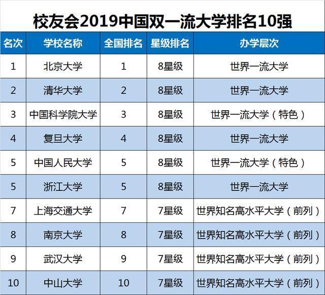 當然十強中其余學校也是我們耳熟能詳的名校,第3至第10名的高校是中國科學院大學、復旦大學、中國人民大學、浙江大學、上海交通大學、南京大學、武漢大學、中山大學。十強前六都榮膺2019中國八星級大學,實力自是不必說。