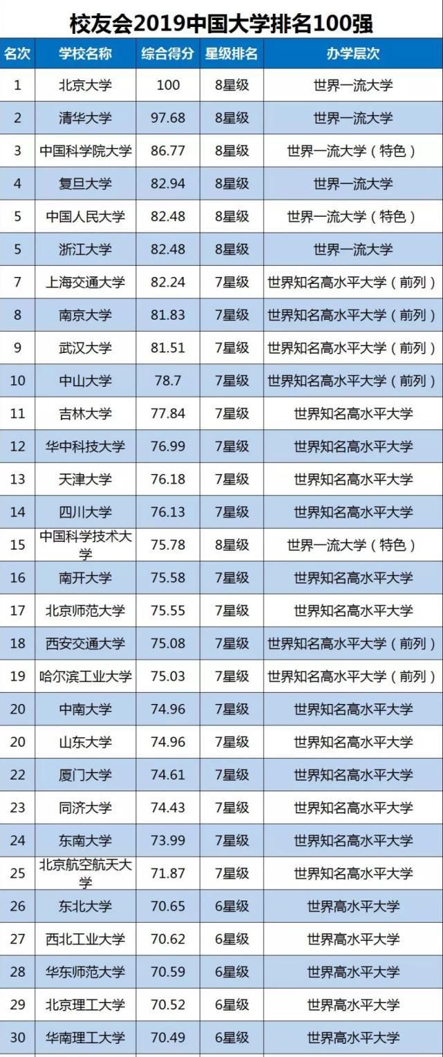 前十雖好,但是我們也要聚焦其他學校,今天整理出校友會2019年中國大學排名100強,看看你的學校排名第幾?無論是高考的學生,還是考研的學生,擇校的時候這些排名也是不能忽視的,有了這些排行榜才知道學校的綜合實力。