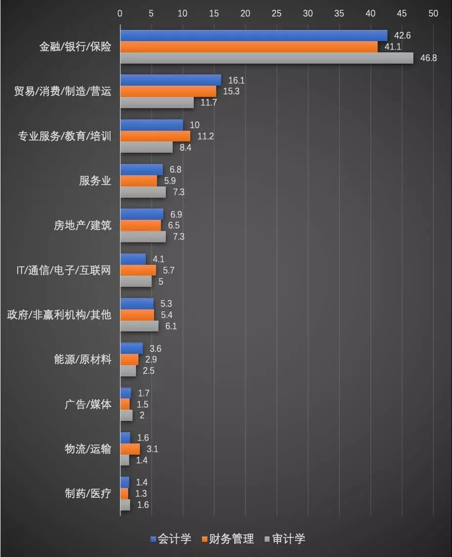 會計學、財務管理、審計學的同學在擇業偏向基本一致。在這三個專業中,金融/銀行/保險行業一枝獨秀,遠高于其他各個行業。