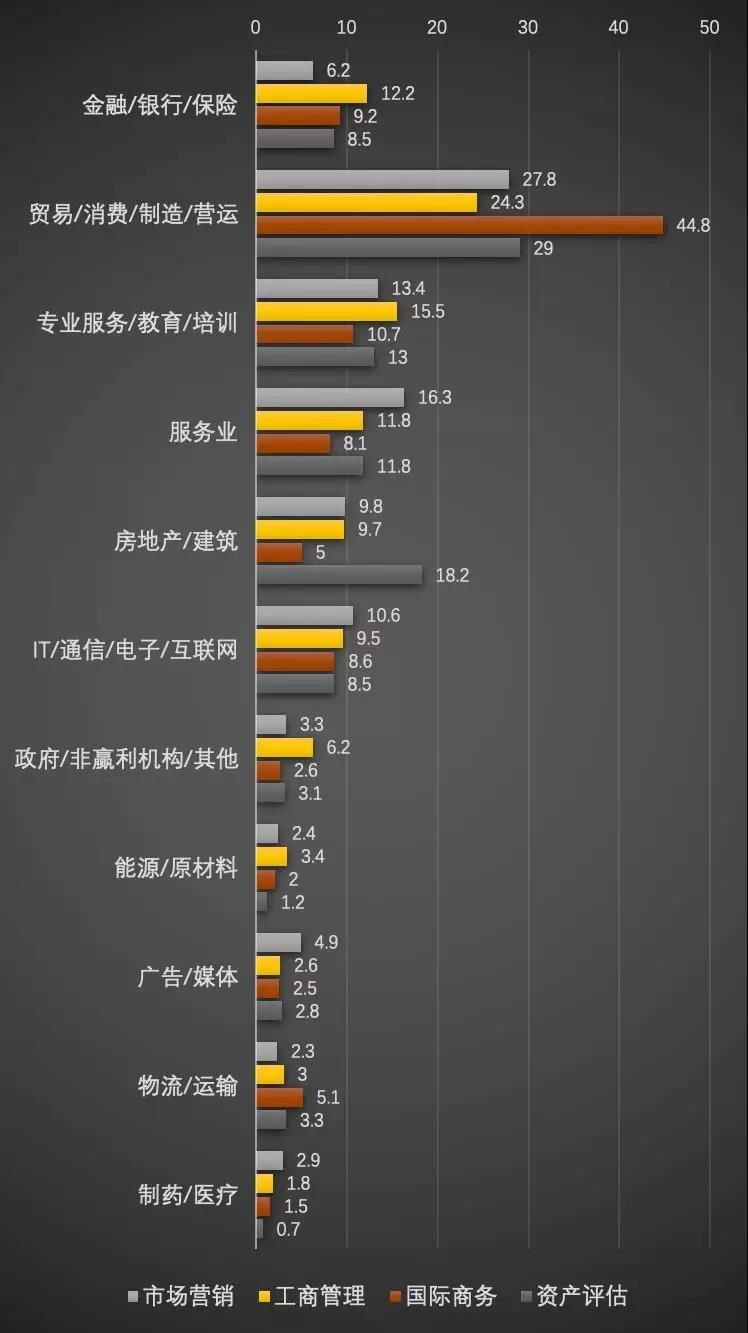 市場營銷、工商管理、國際商務、資產評估各行業擇業占比