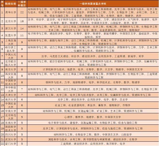 第三次的評(píng)估中擁有國家一級(jí)重點(diǎn)學(xué)科數(shù)最多的是清華大學(xué),共有22個(gè),其次是北京大學(xué)18個(gè),排名第三的是浙江大學(xué),14個(gè),排名第四是的復(fù)旦大學(xué),共計(jì)11個(gè)。這4所大學(xué)都擁有超過10個(gè)以上的一級(jí)重點(diǎn)學(xué)科,它們代表著我國最強(qiáng)的學(xué)科實(shí)力。