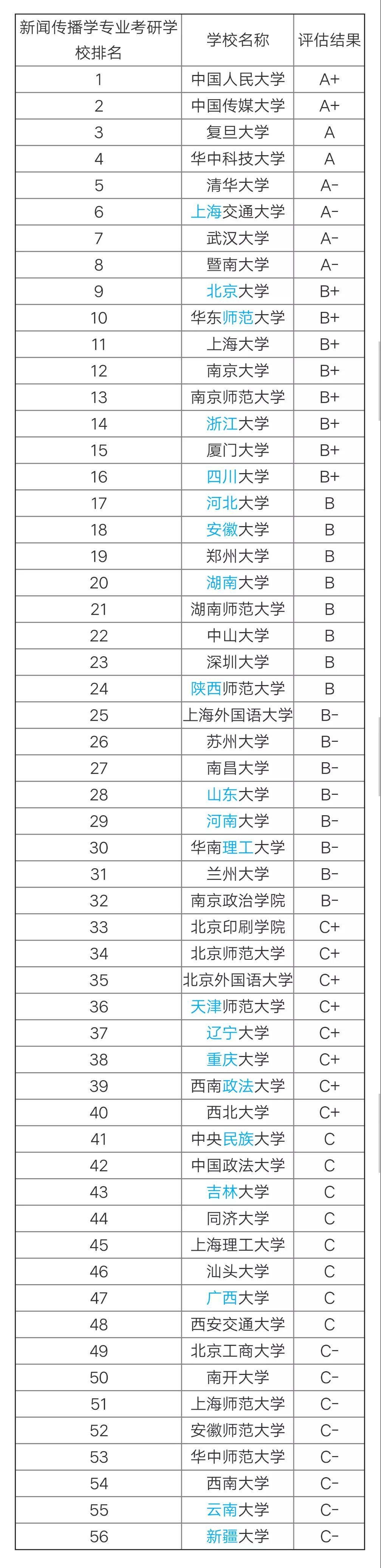 根據(jù)教育部學(xué)位與研究生教育發(fā)展中心最新發(fā)布的第四輪新聞傳播學(xué)專(zhuān)業(yè)學(xué)科評(píng)估結(jié)果可知,全國(guó)共有56所開(kāi)設(shè)新聞傳播學(xué)專(zhuān)業(yè)的大學(xué)參與了排名,其中排名前2的大學(xué)是中國(guó)人民大學(xué)、中國(guó)傳媒大學(xué),以下是新聞傳播學(xué)專(zhuān)業(yè)考研學(xué)校排名具體榜單,是目前比較權(quán)威的排名數(shù)據(jù),供大家參考: