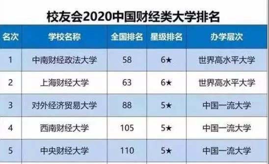 在艾瑞深中國校友會網2020中國大學排名1200強中,中南財經政法大學、上海財經大學、對外經濟貿易大學、西南財經大學、中央財經大學首屈一指,是國內最有名的五所一流財經院校。