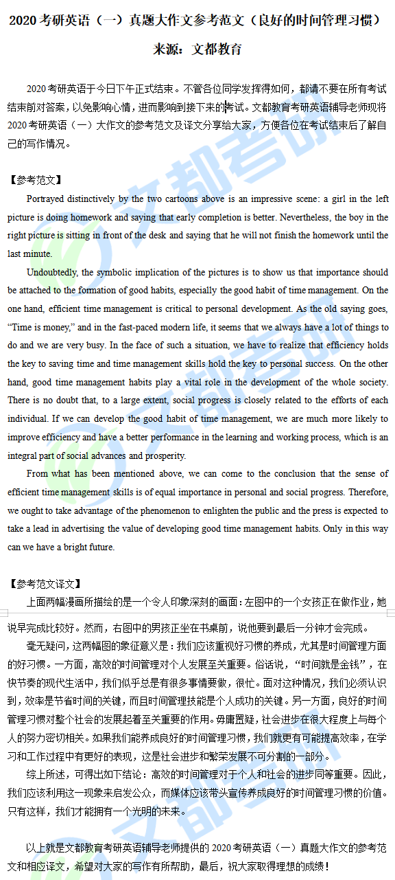 伴隨著2020考研英語的結束,一天也過去了。對于一些同學而言,心情輕松了很多。文都考研網為大家帶來了2020考研英語一真題解析,備受大家關注的2020考研英語一翻譯真題解析也出爐了,快來看看吧。如果你還不清楚,不妨看看2020考研英語(一)寫作真題參考范文:大作文的文章,如有需要及時加入陜西文都20考研交流群, 陜西文都考研網持續為您提供考研所需的相關指導信息。20考研資料共享:【互動可加群】丨官方網站【@陜西文都考研】