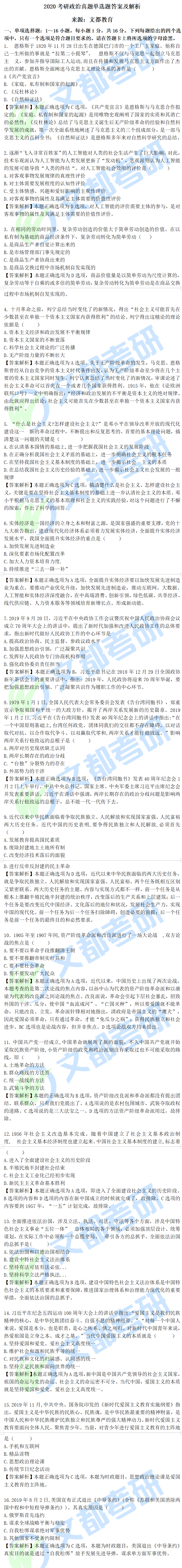2019年12月21號考研政治已經結束了,2020政治考研真題答案也發布了。對于2020考研的同學,文都考研網建議大家不要互相討論,以免影響接下來的考試。如果你還不清楚,不妨看看2020政治考研單選真題解析參考答案的文章,如有需要及時加入陜西文都20考研交流群, 陜西文都考研網持續為您提供考研所需的相關指導信息。20考研資料共享:【互動可加群】丨官方網站【@陜西文都考研