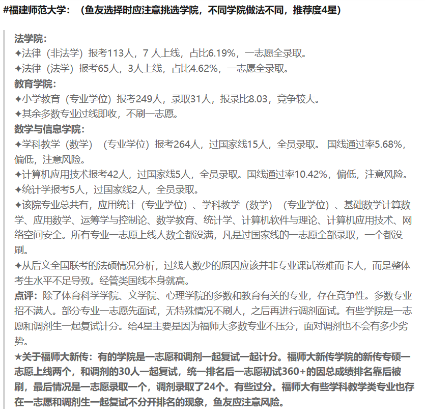 tips:比處,我們不分析專業(yè)課難度。因為專業(yè)課難度需要通過生源比對+專業(yè)課具體狀況等因素才能定檔。意思就是如果有人和你說專業(yè)課很難,這未必準(zhǔn)確。我還要演過對比其他公共課的情況才能進(jìn)行一定程度的比較。比如福師大,其法律碩士(非法學(xué))過線的比例非常低,不知道的人還以為他們專業(yè)課很難。實則是考生整體水平一般導(dǎo)致的。當(dāng)然,法律碩士整體來說的過線的比例就是比較低的。