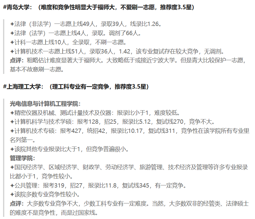 如果能直接獲取報錄比,則可初步量化難度,但要注意報錄比僅在同檔學(xué)校有效,如果套用在不同檔的學(xué)校,會死得很慘。對于考研萌新而言,咱門還需要進(jìn)一步分析難度。最好能發(fā)現(xiàn)那種復(fù)試線又低,專業(yè)課不壓分,又不刷一志愿的。好了,再來看,復(fù)試線+是否接受調(diào)劑/統(tǒng)招計劃+是否保護(hù)一志愿。什么意思呢?就是如果這個學(xué)校的這個專業(yè)劃線不高,說明備考難度不大。如果接受調(diào)劑,說明招不滿人。如果保護(hù)一志愿,說明復(fù)試不會刻意刷人。