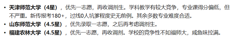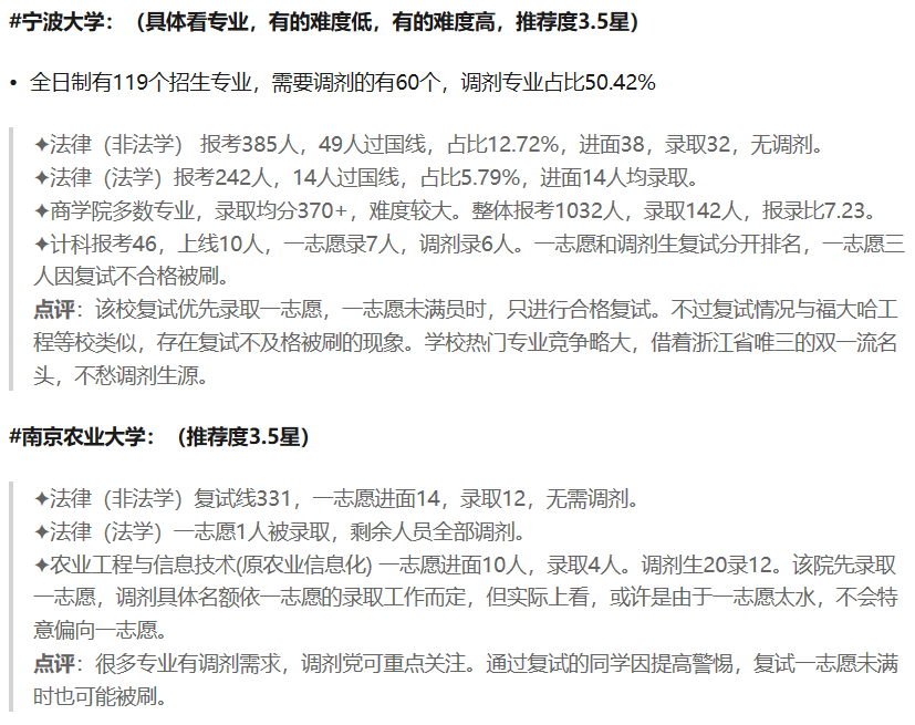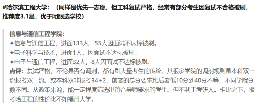 切記切記!!!!并不是所有招收調(diào)劑的專業(yè)一定是好考的。其一要看復(fù)試線,比如某些985有些專業(yè)也是年年收調(diào)劑,但即便一志愿沒滿也不會輕易走國家線,畢竟調(diào)人那么多,根本不愁人數(shù)不足。那么如果復(fù)試線太高,通過初試的難度就很大了。其二要看一志愿錄取率,之前爆出不少高校復(fù)試喜歡刷一志愿然后收985或211的調(diào)劑生,可謂吃相難看,這類學(xué)校,非211考生千萬慎選。