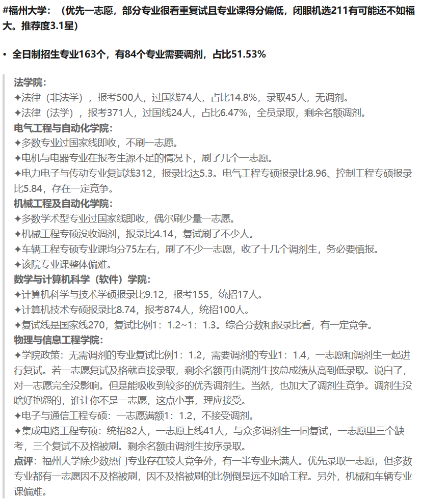 對于二三本乃至專科院校的同學(xué),千萬別看某個普通大學(xué)的報錄比很低,就自信滿滿的報考了。你得了解該校該專業(yè)的歷史行為到底是傾向于寵一志愿,還是喜歡刷一志原然后收211的調(diào)劑生?以福大為例,不同專業(yè)做法截然不同,差距是天差地別。有的專業(yè)不管是否招滿人,都要嚴(yán)格提高復(fù)試要求,甚至在招不滿人的情況還要刷掉一半的人(因為一志愿里多數(shù)都是二三本的,你可以說復(fù)試要求太嚴(yán)格沒通過,也可以說人家就不喜歡二三本的唄,怎么理解,你自己看)。還有的專業(yè),寵一志愿,一個都不能少。