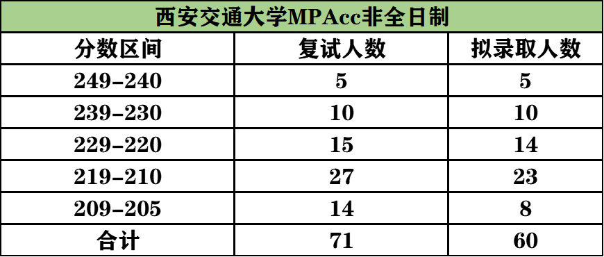 非全日制進(jìn)入復(fù)試合計71人,擬錄取60人,其中最高分為247分,最低分為205分。其中包括提前面試7人,有一人205放棄復(fù)試。