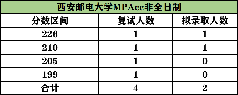 非全日制進(jìn)入復(fù)試4人,錄取2人(分?jǐn)?shù)分別為226分、210分),進(jìn)入復(fù)試最高分226分,最低分199分,錄取最高分226分,最低分210分。