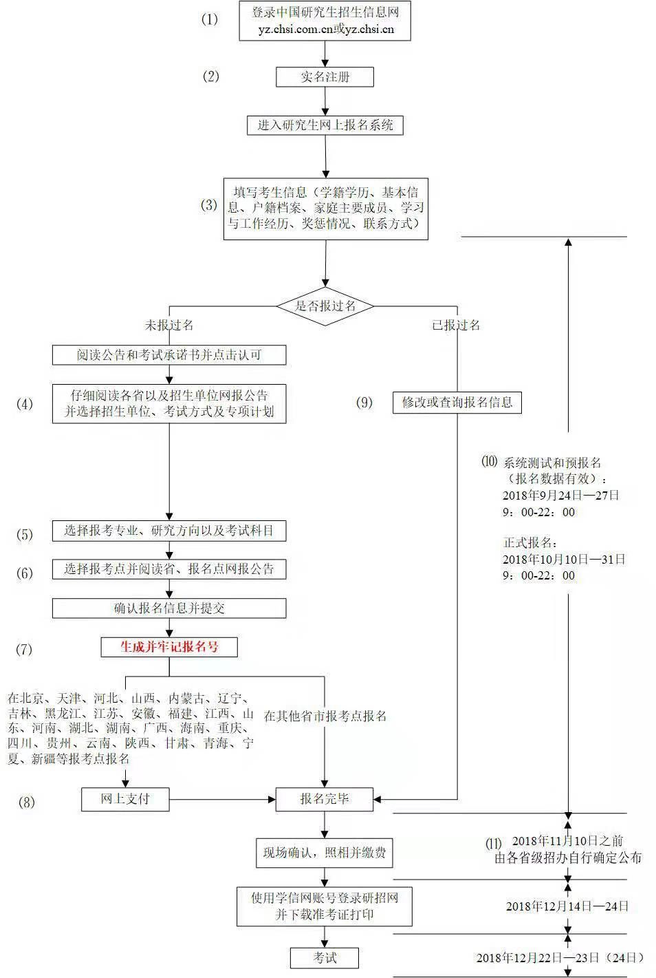 預計2020年9月底:網上預報名。去年網上預報名預計時間為:9月24日-9月27日(每天9:00—22:00)。以2019考研為例,報名流程見下方圖片。