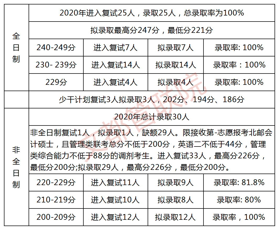 北京郵電大學是2019會計專碩的新增院校。通過表中數據可以看出,2020年初試分數達到229分及以上的全日制考生,100%被錄取;而在非全日制的招生中,30個招生名額,有29人都是從全日制調劑到非全日制的。