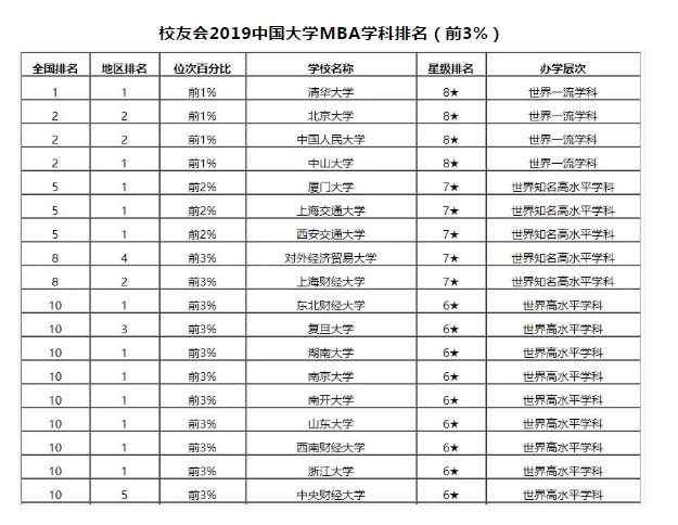 2019校友會中國大學MBA學科排名前十(前3%)院校
