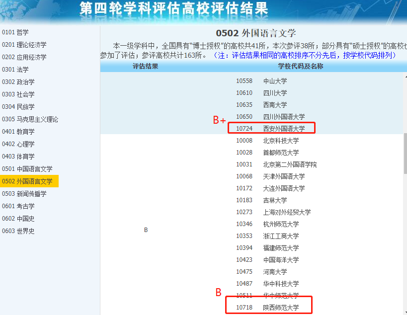 西外外國語言文學專業(yè)評估為B+,陜師大則為B