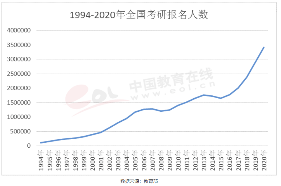 據教育部公布的數據顯示,2019年報名人數增幅達21.85%。繼2019年碩士研究生報名人數高漲之后,2020年碩士研究生報名人數再次打破紀錄,達到341萬人,較2019年增長17.59%。