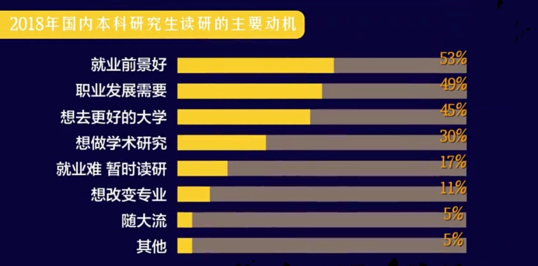 據麥可思的調研數據顯示,2018屆本科畢業生選擇國內讀研的主要動機是“就業前景好”(53%)和“職業發展需要”(49%)。另外,有17%的學生是因為“就業困難”所以選擇讀研,“想做學術研究”的學生僅占30%。
