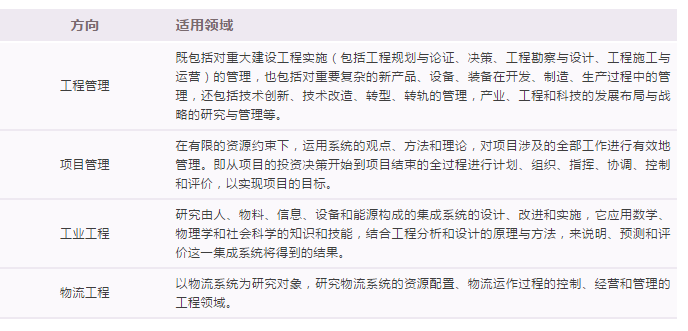 工程管理(125601)、項目管理(125602)、工業工程與管理(125603)、物流工程與管理(125604)