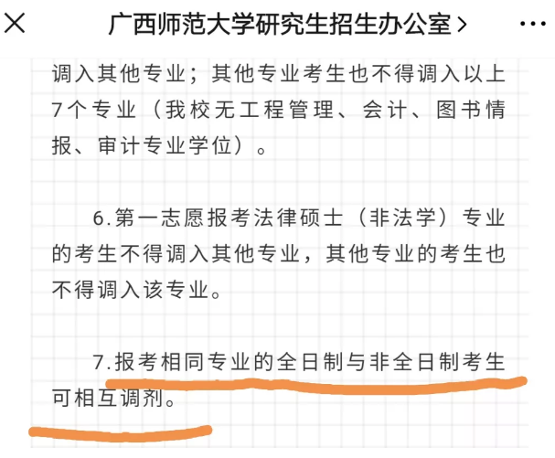 當然目前多數院校還是可以全日制調劑非全的,而且不排除一些特殊情況,比如廣西師范大學最近發布調劑方案: