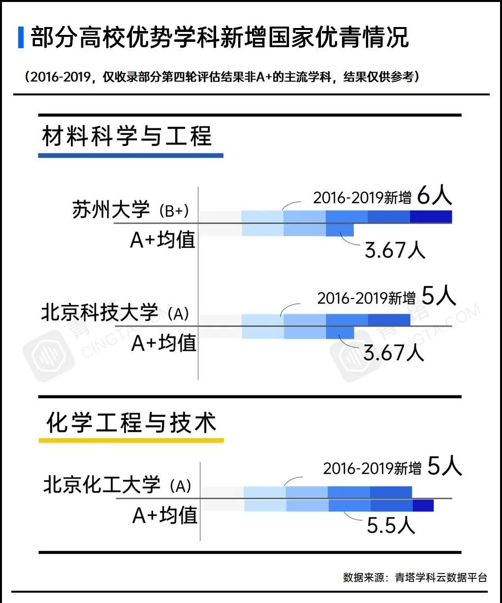 北京化工大學的化學工程與技術,華東理工大學的控制科學與工程,北京科技大學的材料科學與工程均新增杰青2人,表現明顯優于各學科中A+學科的均值。