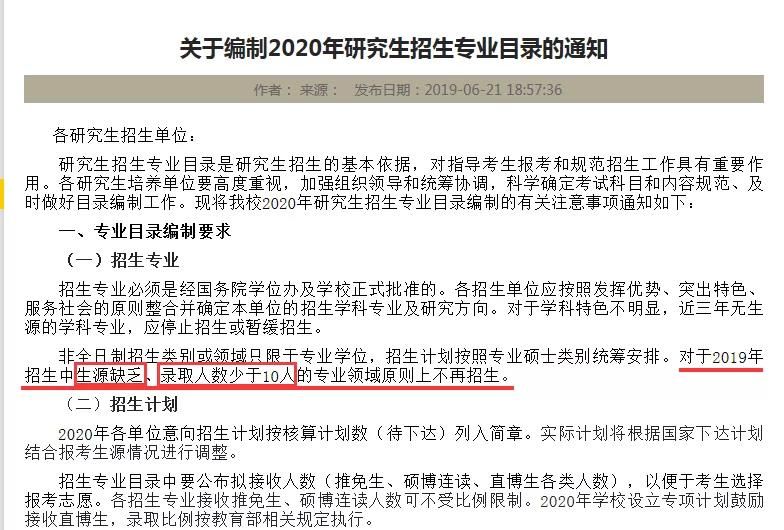 山東理工大學(xué)在關(guān)于“修訂2021年碩士研究生招生專業(yè)目錄的通知”公告中指出“原則上報(bào)考人數(shù)連續(xù)2年少于10人的考試科目不再列入招生專業(yè)目錄”。