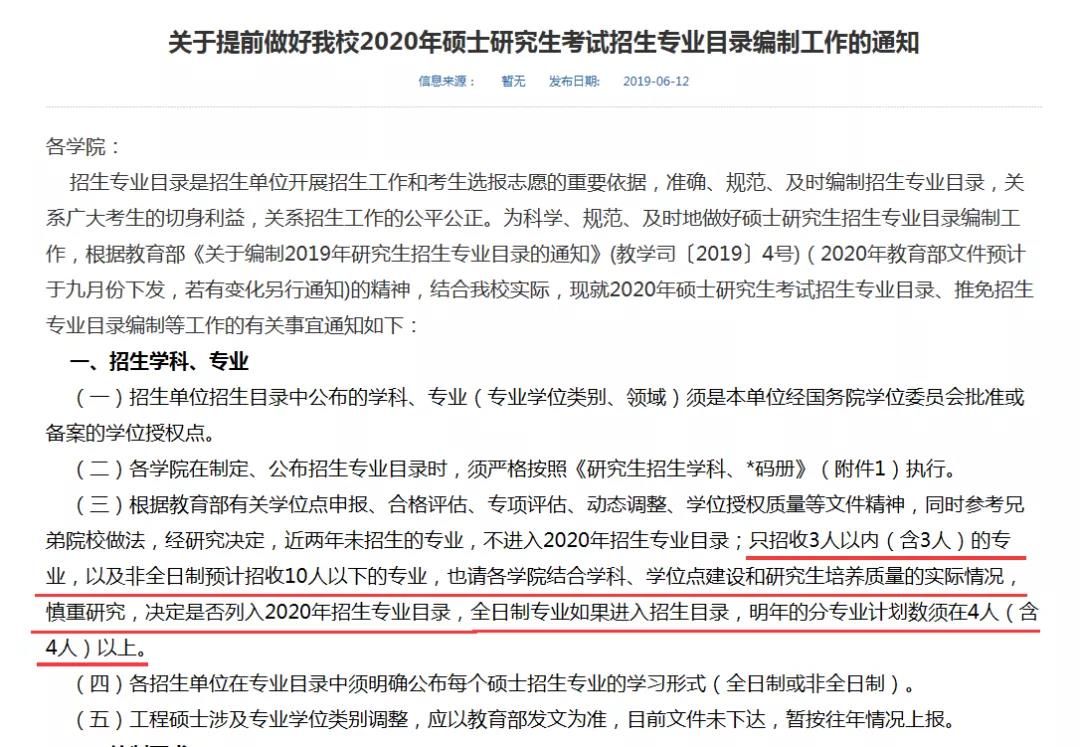 下面是福州大學(xué)20屆的相關(guān)招生公告,公告中明確表示僅招收3人以內(nèi)的全日制專業(yè)各學(xué)院要慎重考慮是否加入專業(yè)目錄,但如果加入專業(yè)目錄,第二年的計(jì)劃招生數(shù)必須在4人及以上。