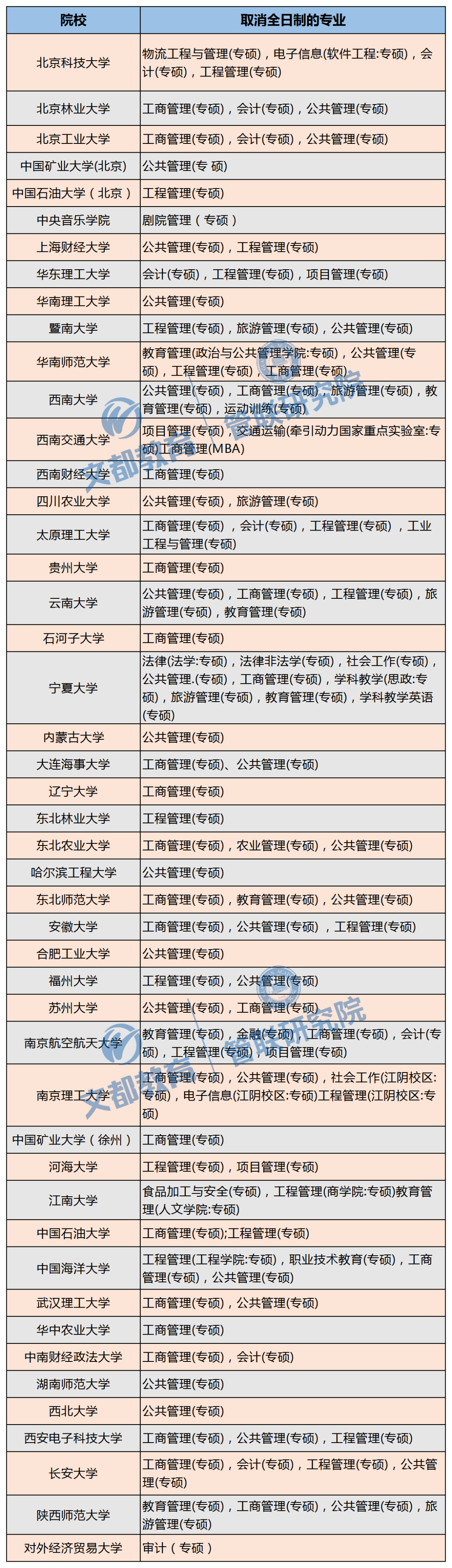 在“非全日制就業要與全日制平等”的呼聲下,非全似乎將成為大趨勢。從近幾年招生情況綜合來看,非全日制的招生比例正在逐年變高,競爭也在變得愈發激烈,非全日制是專業碩士未來發展趨勢已經比較明顯了。這也意味著我們在擇校的時候要多加注意這些專業,做出恰當的選擇。近年,一些院校紛紛取消了全日制的招生,具體名單如下: