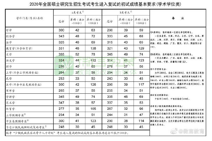 來自教育部公布的《2020年全國(guó)碩士研究生招生考試考生進(jìn)入復(fù)試的初試成績(jī)基本要求》,2020年管理類專業(yè)學(xué)位的的復(fù)試分?jǐn)?shù)線為: