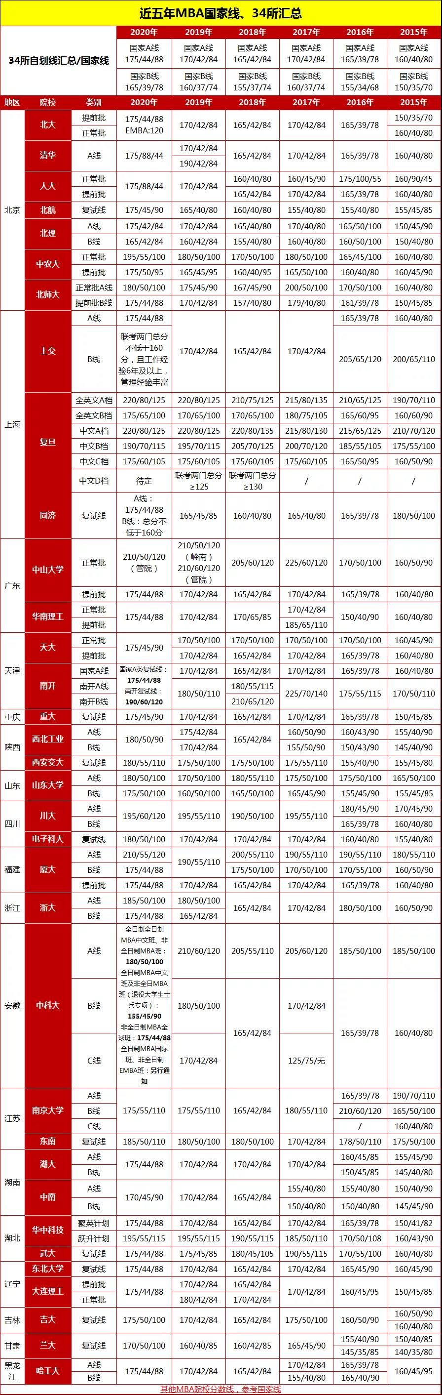 34所MBA2015-2020分數線匯總,21在職考研可參考