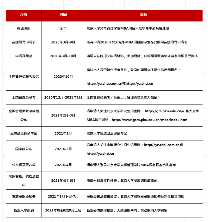 一般流程是:網(wǎng)上提交報(bào)名材料(4—11月,正常5~6批次)——材料資格審核——材料審核通過參加提前面試——網(wǎng)上報(bào)名(10月)——筆試(12月底)——政治復(fù)試(次年3—4月)——錄取:筆試達(dá)到國(guó)家線。(以下是北大光華MBA提面流程)