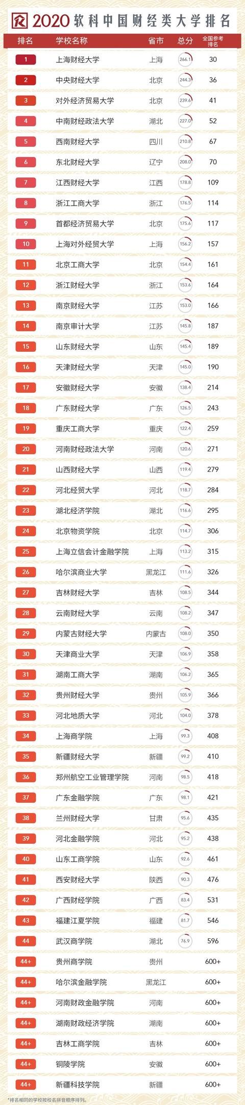 根據(jù)排名顯示,中央財經(jīng)大學(xué)排名第一,上海財經(jīng)大學(xué)排名第二,對外經(jīng)濟貿(mào)易大學(xué)排名第三,中南財經(jīng)政法大學(xué)排名第四,西南財經(jīng)大學(xué)排名第五,東北財經(jīng)大學(xué)位列第六。