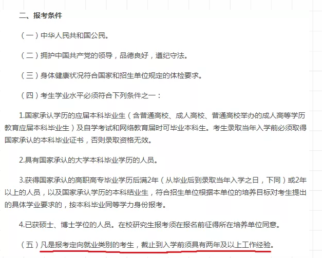 凡是報(bào)考定向就業(yè)類別的考生,截止到入學(xué)前須具有兩年及以上工作經(jīng)驗(yàn)。